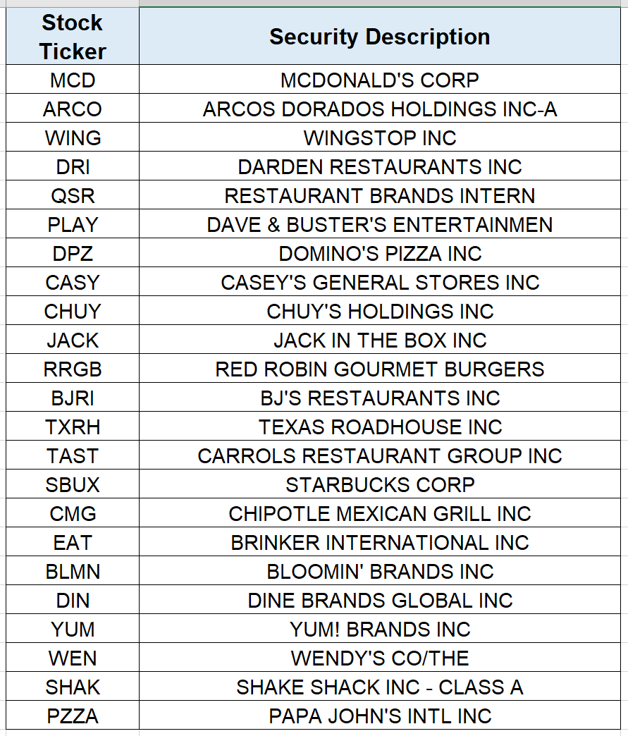 눈에 띄는 것은 맥도날드, 도미노피자, 얌!브랜드, 쉐이크쉑, 파파존스가 있다는 것이다.